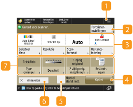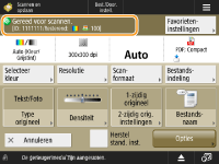 Geeft de instellingenstatus weer van bijvoorbeeld de resolutie en het scanformaat. Controleer de instellingen om goed te kunnen scannen. Om de instellingen te wijzigen, drukt u op de knop onder het weergavegedeelte. Voor meer informatie over bestandsindelingen raadpleegt u