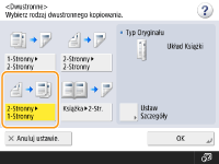 Jeżeli wyświetlany jest ekran wyboru rozmiaru oryginałuJeżeli dla opcji <Wybierz Papier> ustawiono <Aut.>, może zostać wyświetlony ekran wyboru rozmiaru oryginału. Jest on wyświetlany, ponieważ rozmiar oryginału nie może zostać zweryfikowany i papieru nie można wybrać automatycznie w przypadku, gdy chcesz skanować oryginały niezwykle przezroczyste, oryginały, dla których zastosowano niezwykle ciemne kolory podstawowe lub też oryginały o niewielkim formacie. Wybierz rozmiar oryginału lub też rozmiar najbliższy oryginałowi.