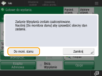 Jeżeli dla opcji <Wyświetl powiado. gdy zadanie zostało zaakceptowa.> wybrano ustawienie <Włącz>, ekran <Monitor stanu> można wyświetlić z poziomu poniższego ekranu wyświetlanego po odebraniu wysłanego zadania.<Wyświetl powiado. gdy zadanie zostało zaakceptowa.>