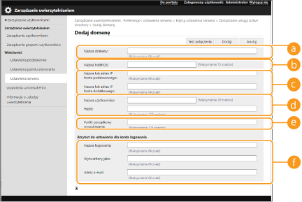 Wybierz sposób ustawiania nazwy domeny osoby logującej się. Aby określić bezpośrednio nazwę domeny, wybierz opcję [Określ nazwę domeny] i wprowadź nazwę domeny. Aby określić pole danych LDAP (nazwa atrybutu) z którego nazwa domeny na serwerze LDAP ma być uzyskana, wybierz [Określ nazwę atrybutu dla pozyskiwania nazwy domeny] i wprowadź nazwę atrybutu (Przykład: dc).