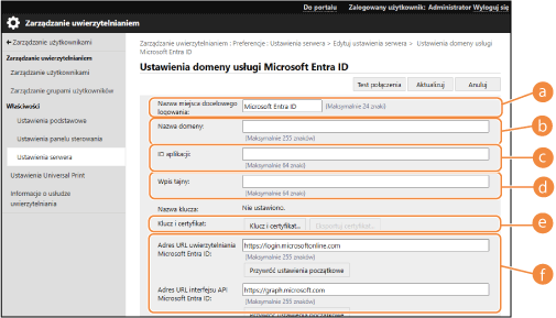 Aby określić Active Directory/serwer LDAP/Microsoft Entra ID jako urządzenie uwierzytelniające, należy zarejestrować informacje o serwerze wykorzystywanym do uwierzytelniania. W razie konieczności, przeprowadź test łączności.