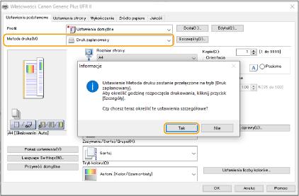 Można ustawić czas rozpoczęcia drukowania, co jest przydatne przy drukowaniu dużych ilości dokumentów w nocy itp.