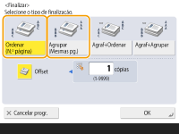 Ao copiar duas cópias ou mais a partir do alimentador, é possível selecionar a ordenação ou o agrupamento para a ordem das impressões. Selecione "Ordenar" para imprimir numa ordem de páginas sequencial. Selecione "Agrupar" para imprimir lotes de cada página como, por exemplo, 10 folhas para a primeira página, 10 folhas para a segunda página e assim sucessivamente.