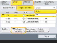 (Contr. estado), será apresentado o ecrã Controlo de estado, que permite verificar o histórico de utilização de cada função, como por exemplo cópia, impressão, envio de correio eletrónico, envio/receção de faxes/I-faxes, etc. A partir deste ecrã também é possível imprimir o histórico de utilização de cada função.