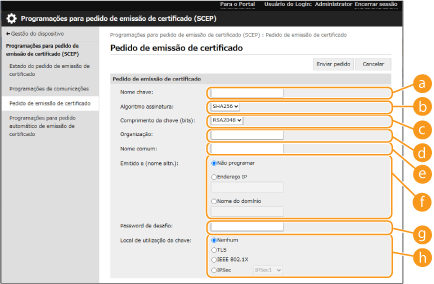 Um pedido manual de emissão de um certificado não pode ser enviado quando estiver selecionado [Ativar temporizador para pedido automático de emissão de certificado]. Pedir a emissão de um certificado à hora especificada