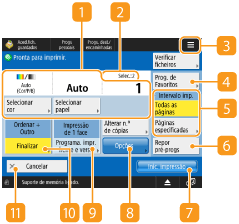 Quando carrega em <Aceder a ficheiros guardados> no ecrã <Início> e depois carrega em <Rede> ou <Suporte de memória> para imprimir ficheiros, é apresentado o seguinte ecrã de programações.