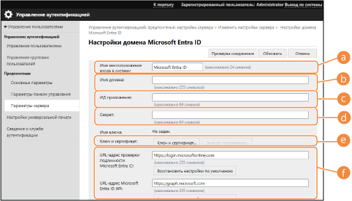 Нажмите [Ключ и сертификат] в случае использования ключа и сертификата. Можно нажать [Экспорт сертификата...] для экспорта сертификата для регистрации в Microsoft Entra ID. Введите секретный ключ, выпущенный Microsoft Entra ID. Нет необходимости вводить секретный ключ, если используется [Ключ и сертификат].