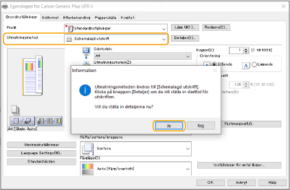 Välj [Schemalagd utskrift] från [Utmatningsmetod] och klicka på [Ja].