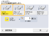仕上げ機能によってはオプションが必要です。オプション機器について 用紙の種類によっては、仕上げ機能を使用できません。機器仕様 原稿台ガラスに原稿をセットしているときコピーの基本画面で<その他の機能> <連続読込>を押すことで、原稿台ガラスに原稿をセットしてもソート/グループ機能を使用できます。グループ出力時にページごとに仕切紙を挿入する<グループ (ページごと)>で出力した場合、ページごとに仕切紙を挿入することができます。設定方法について詳しくは、<グループ間仕切紙>を参照してください。<グループ間仕切紙> <保存ファイルの利用>機能から設定するときPDF/XPSファイルをプリントするときのみ、仕上げ機能を利用できます。 |
