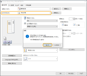 [出力方法]で[予約印刷]を選び、[はい]をクリックする
