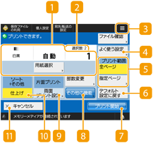 プリントする用紙サイズや部数の設定状況が表示されます。正しくプリントするために、必ずここの設定内容を確認してください。設定を変更するときは、表示部の下にあるボタンを押します。また、部数を変更するときは、テンキーで部数を入力します。