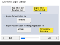 To enhance the security of the machine, use the machine under a system that uses user authentication. ![]() This machine is set to use the user authentication as the login service. For more information, see Configuring the Personal Authentication Management Settings. ![]() Press <On> for <Use User Authentication>, press <On> for the login method to use, and press <Next>. If you do not use user authentication, press <Off> for <Use User Authentication>, press <OK>, and proceed to Step 5. ![]() Specify the following settings if there are no administrators besides the "Administrator" user registered in the machine. ![]() To enhance the security of the machine by disabling the "Administrator" user and registering a new administrator, press <Yes>. In <Register Administrator>, enter <User Name> and <Password>, and press <OK>. Specify <E-Mail Address>, <Department ID>, and <Display Name> as necessary. For more information, see Registering User Information in the Local Device. The "Administrator" user will be disabled the next time you log in. To operate as "Administrator," press <No>. ![]() ![]() Select the timing for displaying the login screen. If you select <Display When Func. Selected>, press <Functions>, select the function to display the login screen for, and press <OK>. Also, select the setting items on the <Settings/Registration> screen to display the login screen for. If you select <Off> for <Keyboard Authentication>, press <OK>. Proceed to step 5. If you select <On> for <Keyboard Authentication>, press <Next>. ![]() ![]() To use authentication via numeric key entry only on the login screen, press <On>, and press <OK>. | |