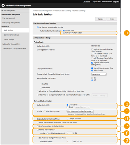 Whenever Picture Login is activated, the authentication device for keyboard authentication is fixed to [Local Device]. If you want to log in with a user account that is registered in an authentication server, disable Picture Login.