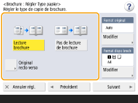Appuyez sur <Modifier> dans <Format original> et sélectionnez la taille de l'original. Si vous sélectionnez <Auto>, le format de la brochure est automatiquement sélectionné en fonction de la taille de l'original.