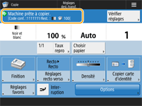 Affiche l'état des réglages, comme l'agrandissement, le format papier et le nombre de copies. Veillez à vérifier les réglages afin de copier correctement. Pour modifier les réglages, appuyez sur le bouton sous la section affichage.