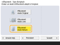 1 | Appuyez sur <Effacement mode Livre> et confirmez <Format original>. ![]() Si le format affiché dans <Format original> est différent du format du livre installé, appuyez sur <Modifier> pour sélectionner le bon format. |