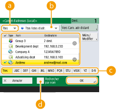 Liste déroulante des listes d’adressesVous permet d'afficher un groupe spécifique de destinataires. Quand vous êtes connecté à l'appareil avec la gestion de l'authentification personnelle, vous pouvez sélectionner <Liste d'adr. perso.> pour afficher votre carnet d'adresses personnel.