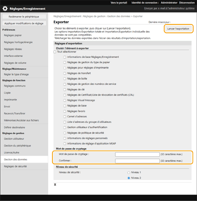 sélectionnez le niveau de sécurité dans [Niveau de sécurité] cliquez sur [Lancer l'exportation]