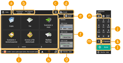È possibile controllare lo stato di stampa, lo stato di invio/ricezione fax, la cronologia di utilizzo, ecc. Inoltre, consente di controllare la quantità rimanente di carta e toner, lo stato di errore, ecc.