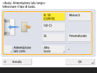 2 | Selezionare l'orientamento e il tipo di busta. ![]() Se è stato modificato il posizionamento delle buste, premere <Alimentazione lato corto> o <Alimentazione lato lungo> e selezionare il tipo di busta. Se è stato scelto il posizionamento verticale per le buste Nagagata 3, premere <Avanti> e specificare la lunghezza della linguetta. Per registrare una busta in formato personalizzato, premere <Personalizzato> <Avanti> quindi <X> o <Y> per specificare il lato, quindi utilizzare i tasti numerici per inserire la lunghezza del lato specificato.![]() Quando si usano le buste Kakugata 2, posizionarle orizzontalmente. |