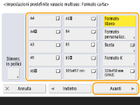 1 | Premere <Formato personalizz.>. ![]() Il formato della carta può essere specificato tramite <Formato libero>, che elimina la necessità di inserire le impostazioni relative al formato. Specificare <Formato libero> quando si carica carta dal formato sconosciuto da utilizzare per la copia o quando il formato della carta è già registrato nel driver della stampante. |