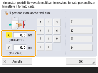 Premere <X> o <Y> per inserire la lunghezza di ciascun lato usando i tasti numerici. ![]() Se si registra il formato carta usato frequentemente sui pulsanti da <S1> a <S4>, è possibile richiamarlo tramite la pressione di un solo tasto. Registrazione della carta di formato libero (carta di formato personalizzato) | |
