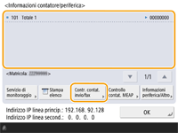 È possibile stampare un elenco che mostra il numero di pagine usate per la copia, la stampa, la scansione e i fax. È possibile verificare anche le informazioni contatore per ogni MEAP. Premere <Controllo contatore MEAP> nella schermata del passaggio 2. Se si preme <Informazioni periferica/Altro> <Contr. config. periferica> nella stessa schermata, è possibile verificare le opzioni installate nella macchina.Per informazioni sulle condizioni di conteggio, contattare il rivenditore o il rappresentante di servizio. Per informazioni sul <Servizio di monitoraggio>, contattare il proprio rivenditore o il rappresentante dell’assistenza. |