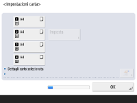 Verificare che la carta caricata nella fonte di alimentazione sia specificata correttamente. ![]() ![]() Se i formati carta sono corretti, premere <OK>. Per le informazioni sullo schermo e le istruzioni su come cambiare le impostazioni, vedere Indicazione di formato e tipo di carta nel cassetto. Se non è stato eseguito l'accesso come amministratore, procedere al passo 10. | |