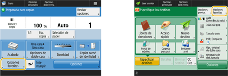 Si suele utilizar la misma combinación de ajustes para realizar copias, mandar un fax y escanear, le recomendamos que registre dichos ajustes como <Opciones favoritas>.