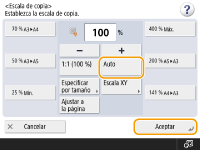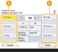 ![]() | Puede ampliar o reducir especificando la escala de copia (%). Puede especificar la escala vertical y horizontal por separado. Ampliar o reducir copias especificando la escala de copia | |