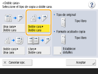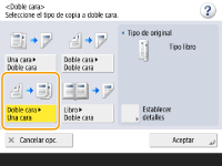 Solo puede utilizarse papel A4 para <Libro Doble cara>.Coloque los originales en el cristal de copia utilizando <Libro Doble cara>. |