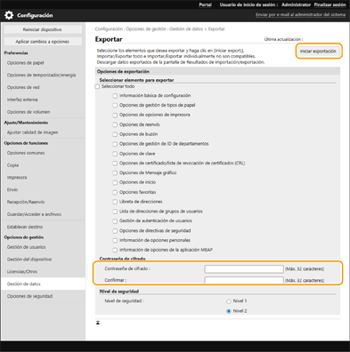 seleccione el nivel de seguridad en [Nivel de seguridad] haga clic en [Iniciar exportación]