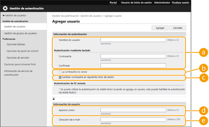 [Cambiar contraseña en siguiente inicio de sesión]Seleccione esta casilla de verificación para obligar a los usuarios registrados a cambiar de contraseña la primera vez que inicien sesión. Cuando el usuario cambie la contraseña, la casilla se desmarcará automáticamente.