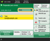 Comprobar el número total de destinos especificadosEn la parte superior derecha de la pantalla se muestra el número total de destinos especificados. Esto le permite confirmar antes de proceder al envío que el número de destinos es correcto. ![]() Para cancelar inmediatamente un trabajo que se está enviandoSi pulsa (Detener) en el panel de control mientras se está enviando un trabajo, aparecerá el mensaje <¿Desea cancelar el siguiente trabajo de envío?>. Pulse <Sí> para cancelar el envío.Puede seleccionar <Último trabajo recibido> o <Trabajo que se está enviando> seleccionar el trabajo que desea cancelar. <Trabajo que se cancelará al pulsar Detener> Pulse (Detener) cuando haya varios trabajos de envío que mostrar en la pantalla para seleccionar el trabajo de envío que desea cancelar. Si no se muestra el trabajo de envío que desea cancelar, pulse <Compruebe otros trab.> para mostrar <Trabajos de envío>. Seleccione el trabajo que desea cancelar y pulse <Cancelar>.Para consultar los estados de los documentos enviados/guardadosEn la pantalla <Monitor estado>, puede consultar los estados de los documentos enviados. En esta pantalla puede volver a enviar/guardar faxes o cancelar el envío/guardado tras consultar los estados. Comprobar el estado y el registro de los documentos escaneados Cuando <Mostrar notificación cuando se acepta el trabajo> está establecido en <Sí>, la pantalla <Monitor estado> puede mostrarse desde la siguiente pantalla mostrada tras la recepción de un trabajo enviado.<Mostrar notificación cuando se acepta el trabajo> ![]() Para imprimir el informe de los resultados del envío/guardadoEn la pantalla de Funciones básicas de lectura, al pulsar <Opciones> <Informe result. de TX> puede configurar que se imprima automáticamente el informe con la lista de resultados del envío/guardado.Para establecer esto para cada trabajo en <Opciones>, es necesario seleccionar <Sólo en caso de error> o <No> en <Informe result. de TX> y, a continuación, configurar <Permitir impresión desde opciones> en <Sí>. Nombre de archivoCuando se envía/guarda un archivo, el nombre de archivo se establece automáticamente según el formato siguiente. Puede cambiar la configuración para poder asignar un nombre. Configurar un nombre de archivo Al enviar por correo electrónico "Números de trabajo (cuatro dígitos)_números de página (tres dígitos).nombre de extensión de archivo", como "1042_001.jpg" Al guardar en un servidor de archivos "El año, mes, día, hora, minuto y segundo en que se guarda el archivo (14 dígitos).nombre de extensión de archivo", como "20151030133541.jpg" Asunto del correo electrónicoEl asunto introducido en <Asunto prefijado> se establece automáticamente (<Asunto prefijado>). Si especifica un asunto distinto, cambie la opción o especifíquelo cada vez que envíe un correo electrónico (Especificar las opciones de correo electrónico). |