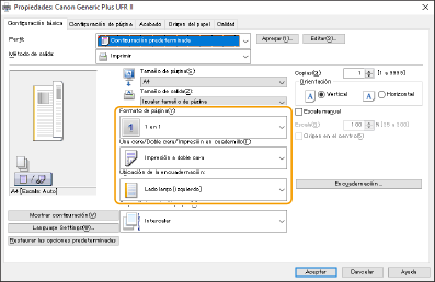3 | Mientras comprueba la vista preliminar, establezca [Formato de página] [Orden de páginas] [Una cara/Doble cara/Impresión en cuadernillo] [Ubicación de la encuadernación].![]() |