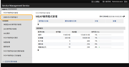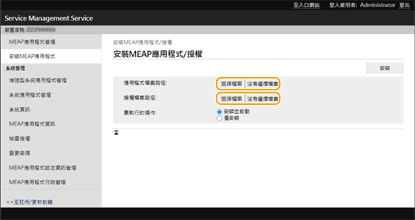 您可以查看已安裝的應用程式數量和已使用的儲存裝置空間。管理 MEAP 應用程式 如果您的 MEAP 應用程式並未隨附授權存取號碼,您的授權檔案會由您的 MEAP 應用程式提供者提供。不需要本節介紹的授權金鑰與授權檔案。如需詳細資訊,請參閱隨每個 MEAP 應用程式提供的手冊。 視 MEAP 應用程式而定,其可能需要特定安裝條件。如需詳細資訊,請參閱要使用之 MEAP 應用程式的使用者手冊。 本機可安裝的 MEAP 應用程式數量上限為 19。 |