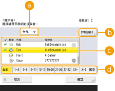2 | 選擇要在群組中註冊的接收者,然後按 <確定>。 ![]() 接收者類型下拉式清單選擇 (電子郵件)、 (傳真)、 (網際網路傳真) 或 (檔案)篩選位址清單 ( ) 中顯示的接收者。按 <全部> 顯示所有註冊的接收者。 <詳細資訊/編輯>如果要檢查接收者的設定,請選擇接收者,然後按 <詳細資訊/編輯>。按 <確定> 返回上一畫面。 接收者清單您於步驟 6 中選擇的通訊清單內註冊的接收者將顯示。從此清單中,選擇要在群組中註冊的接收者。 ![]() 使用存取號碼管理接收者時,除非您輸入存取號碼 (限制對在通訊錄註冊之接收者的存取),否則這些接收者不會在按 <存取號> 後於清單中顯示。 首個字母按鈕選擇接收者名稱第一個字元的英數按鈕。按 <全部> 以顯示所有註冊的接收者。 |