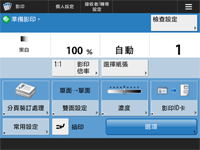 按 <首頁> 畫面及基本功能畫面顯示的 以便自訂畫面,例如重新排列按鈕或建立快速鍵。自訂觸控面板顯示幕![]() 您可以變更與畫面顯示有關的設定,例如開啟本機電源後立即顯示的畫面,以及是否對於剩餘紙張和碳粉顯示訊息。<顯示設定> 您可以設定經過一段時間不操作將顯示的畫面。<自動重設後的功能> |