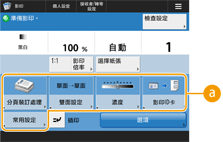基本功能畫面上的設定項目數和要顯示的位置會視功能而不同。 如果將 <未分配> 設為快速鍵,快速鍵按鈕不會顯示。 您可在 <選項> 註冊的快速鍵數量限制如下。 影印:5 傳真:4 掃描並傳送:2 |
