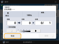 如果在顯示影印基本功能畫面時按下控制面板上的 (停止),影印工作就會暫停,然後顯示 <停止選擇要取消的「影印」工作。> 訊息,以及影印工作清單。您可以在清單中選擇影印工作,並按下 <取消> 取消該工作。如果您使用個人認證管理登入,並按下控制面板上的 (停止) 後登出,以顯示 <停止選擇要取消的「影印」工作。> 訊息,以及影印工作清單,則會取消登出使用者最後執行的工作並恢復其他工作。 |