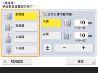 如果輸入小於 0 的數字,裝訂邊會設定在步驟 4 中指定位置的相反側。影印的是已經有裝訂邊的原稿時,如果想要縮減裝訂邊的寬度,可以使用這項功能。