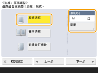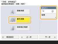 1 | 按下 <原稿消框>,然後設定 <原稿尺寸>。 ![]() 如果 <原稿尺寸> 中顯示的尺寸與您設定的原稿尺寸不同,請按 <變更> 以選擇尺寸。 |