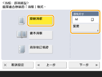 <消框>。1 | 按下 <原稿消框> 並勾選 <原稿尺寸>。 ![]() 如果 <原稿尺寸> 中顯示的尺寸不同於原稿尺寸,請按下 <變更> 選擇尺寸。您只能針對觸控面板顯示幕上顯示的原稿尺寸來設定「原稿消框」模式。 |