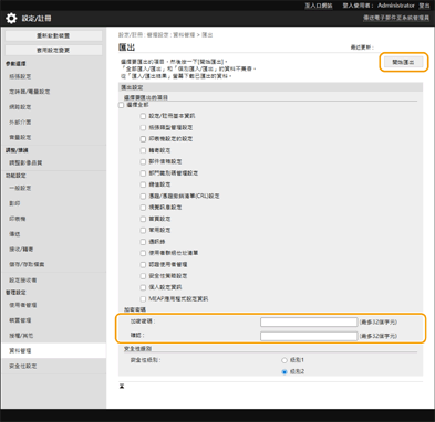 匯入匯出的設定資料時需要 [加密密碼] 中的密碼。使用英數字元。
