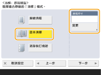 <消框>。1 | 按下 <原稿消框> 並勾選 <原稿尺寸>。 ![]() 如果 <原稿尺寸> 中顯示的尺寸不同於原稿尺寸,請按下 <變更> 選擇尺寸。您只能掃描觸控面板顯示幕上顯示的原稿尺寸。 |