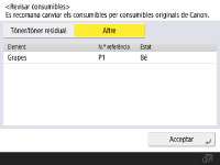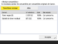 Encara quan es mostra <Cal canviar-ho.> a <Dies restants>, no realitzeu la substitució fins que es mostri un missatge que us indiqui que substituïu els consumibles a l'àrea d'exhibició d'estat (a la part inferior de la pantalla del tauler tàctil).