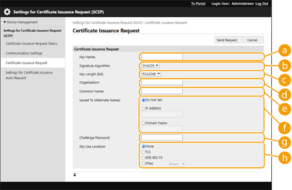 Es pot enviar una sol·licitud d'emissió del certificat requerit per a les claus generades amb l'equip a un servidor SCEP (Protocol de registre simple de certificats) que gestiona els certificats. Els certificats emesos del servidor SCEP es registren automàticament a l'equip. Es requereixen privilegis d'Administrator per enviar una sol·licitud per emetre un certificat.