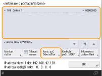 <Kontr. konfig. zařízení> na stejné obrazovce, můžete zkontrolovat volitelné doplňky nainstalované ve stroji.Informace týkající se podmínek počtu získáte u prodejce nebo servisního zástupce.