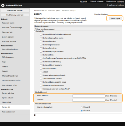 vyberte úroveň zabezpečení z [Úroveň zabezpečení] klikněte na [Spustit export]
