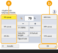 Når skærmbilledet til valg af originalen visesHvis <Vælg papir> er indstillet til <Auto>, vises skærmbilledet til valg af originalens format muligvis. Dette vises, fordi formatet på originalen ikke kan verificeres, og papir ikke kan vælges automatisk, når originaler med høj gennemsigtighed, originaler med ekstrem stærk grundfarve eller små originaler anbringes. Vælg originalformatet eller et format tæt på originalformatet.